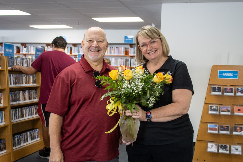 Community support was evident throughout the day Monday, with former Library Board member Ron Willison and Palm Springs Director of Library Services Jeannie Kays’ husband bringing flowers while Kays was being interviewed, and a regular library visitor presenting a special two-layer cake shaped like books with “Next Chapter” written in frosting.