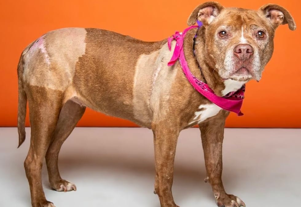 Today,ย we invite you to meet the sweet terrier/pit bull mix, Tia. Sheโs 12 years old, and staff at the shelter say sheโs good at meeting new people and good on leash.ย