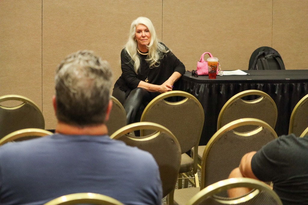 Lauri Kibby, one of the development partners in a planned Dream Hotel, speaks with a neighbor of the project during a community meeting at the city’s convention center Thursday.