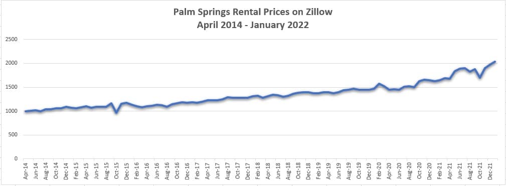 - Rents for all available units on Zillow increased annually at a rate of 5.8% between the start of 2014 and the end of 2019 in Palm Springs, then increased 10% in 2020. In 2021, they spiked 25% on both Zillow and and Rent.com.