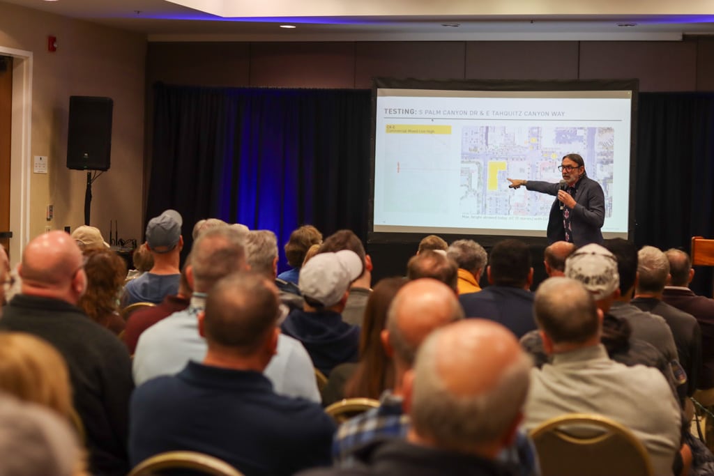 Roughly 60 residents packed a room during a Monday evening meeting at the Palm Springs Convention Center to challenge proposed zoning changes that could allow five-story buildings along commercial corridors adjacent to single-family homes. Homeowners expressed concerns about property values and building heights, sometimes in heated exchanges with city officials.