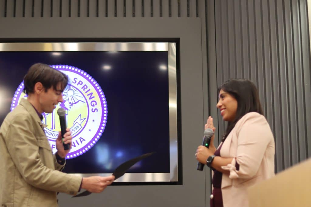 Current Palm Springs Mayor Naomi Soto is sworn in by her husband, Brendan Steidle, in December 2025. (File photo)