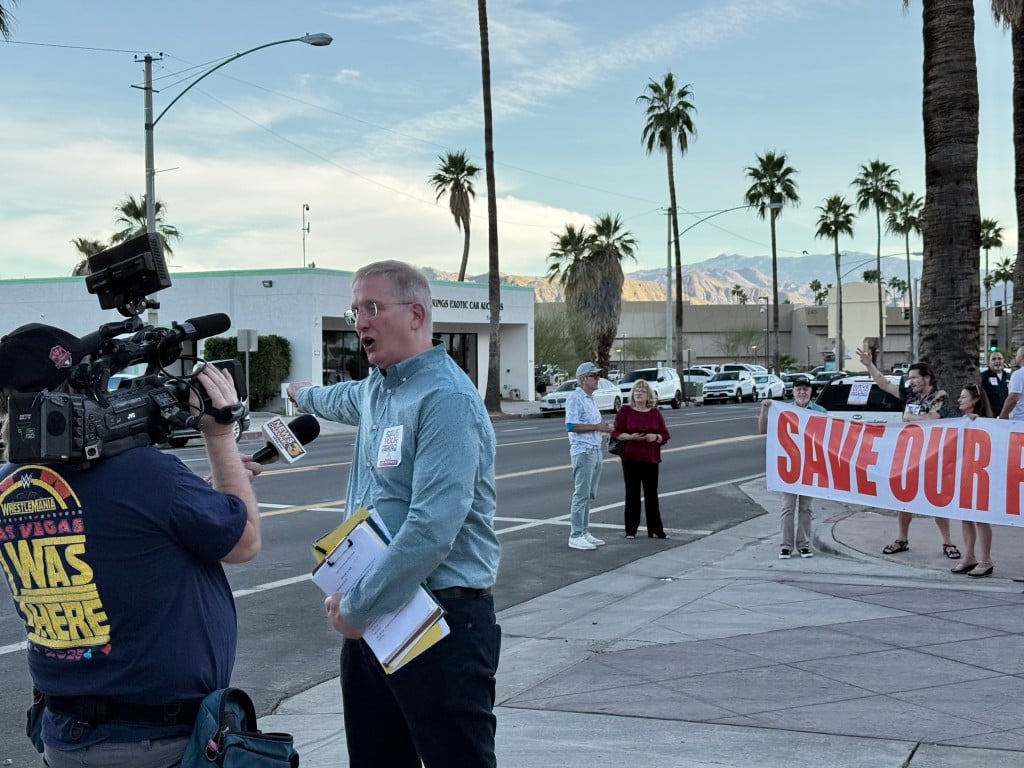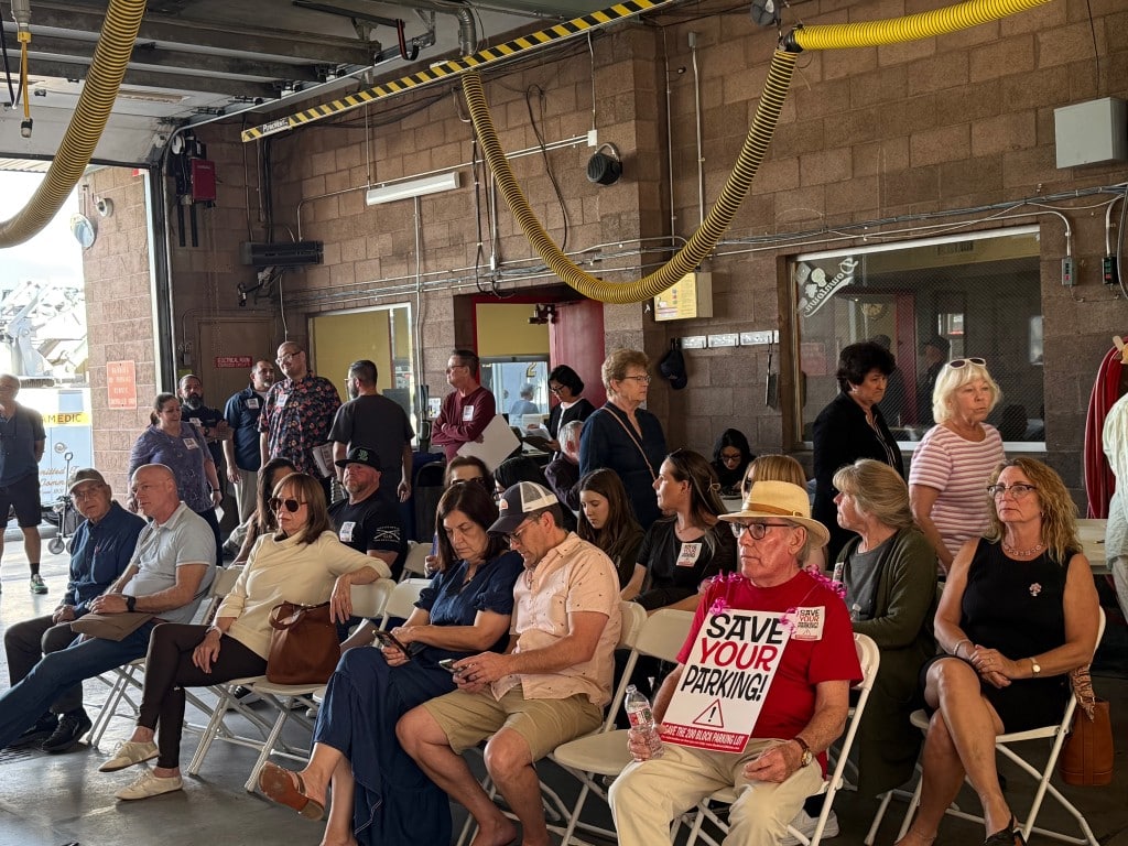 The meeting included a public comment period, during which two dozen participants representing the “Block 200 Club” walked out to protest a two-minute limit on individual comments. The group, made up of property owners from the 200 and 300 blocks of North Palm Canyon Drive, gathered outside with a “Save Our Parking” banner to voice concerns over the potential loss of a portion of a parking lot.
