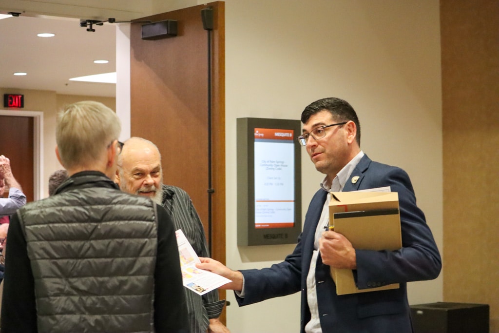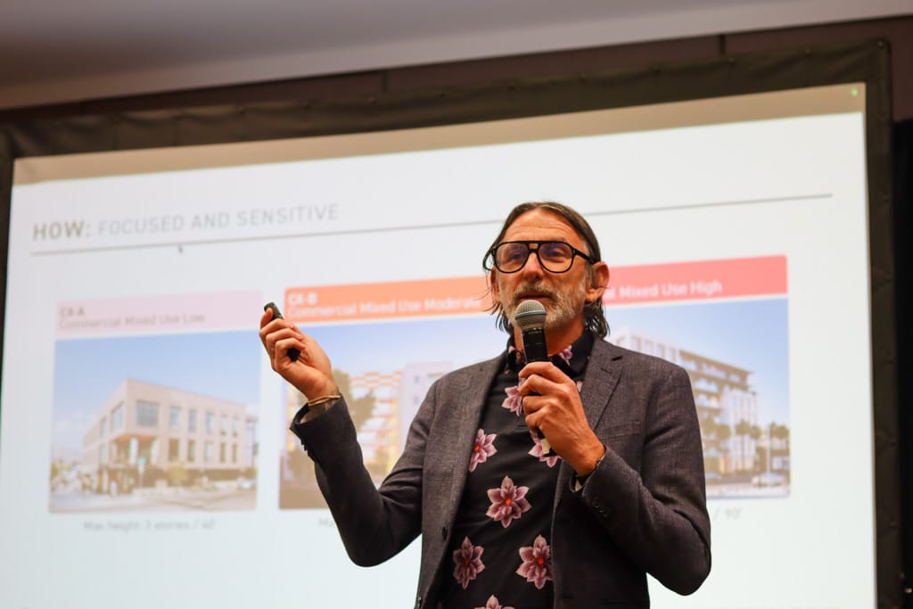 Roughly 60 residents filled a room at the Palm Springs Convention Center Monday evening to hear about and discuss proposed zoning changes that could bring five-story buildings to commercial corridors near single-family neighborhoods, with residents voicing concerns over property values and building heights, sometimes in heated exchanges with city officials.