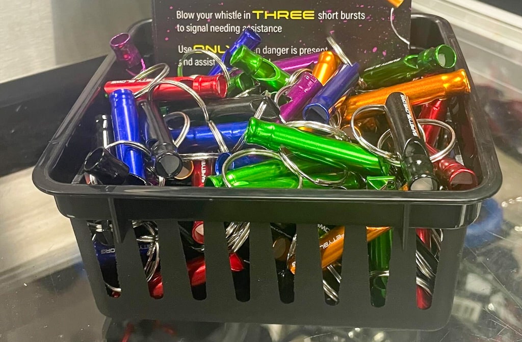 In addition to whistle distribution, the program is launching โSafety Blows Safe Space,โ which provides 8-by-8-inch signs that businesses can display in their windows.
